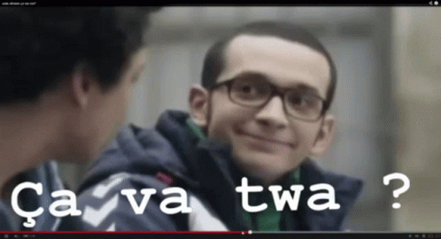 Yoli, a man with glasses, smiles while asking 'Ça va twa?' to another person.