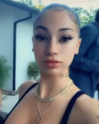 Bhad Bhabie poses for the camera, showing off her necklace, black tank top, and neck tattoo.