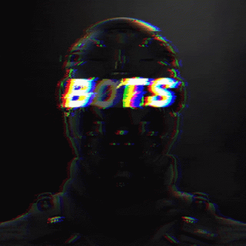 Futuristic robot head with 'BOTS' text across its eyes, featuring a vibrant glitch effect.