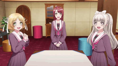 Haruna Kasuga, Shiratori Kurumi, and Takeshita Miiko from D4DJ All Mix's Lyrical Lily celebrate joyfully.