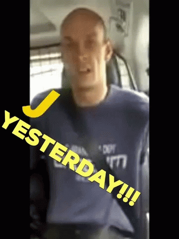 Man in blue shirt reacts with "Yeah! YESTERDAY!!!" text overlay, expressing exasperation or disgust.