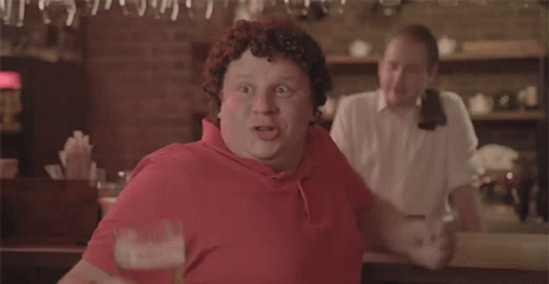 Russian actor Evgeniy Kulik makes a hilarious, excited face while holding a glass of beer in a pub.