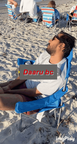 Man relaxing on a beach chair with 'Daaru bc' text overlay, implying he's done with alcohol.