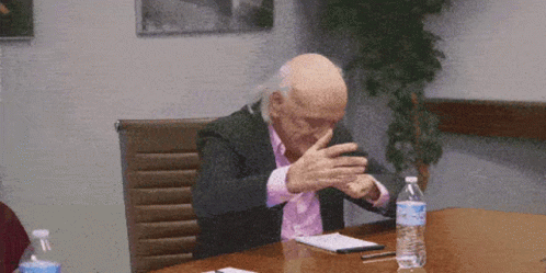 A man in a bald cap dabs during a focus group meeting, a scene from I Think You Should Leave.