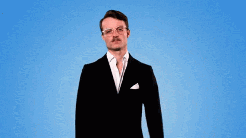 A man in a black suit and glasses performs a dab dance move with a serious expression against a blue background.