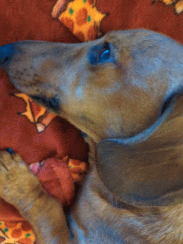 A cute Dachshund puppy, possibly named Cayde or Oodie, is sound asleep on a cozy blanket with a pizza pattern.