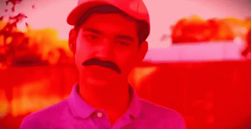 A man with a fake mustache and cap dances outdoors in a blue polo shirt with a green filter.