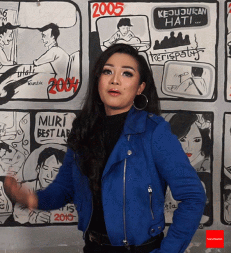 Fitri Carlina waves goodbye in a blue jacket, standing against a comic strip wall, performing her song.
