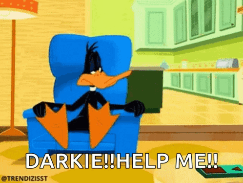 Daffy Dack struggling to get out of a blue armchair, experiencing severe back pain.