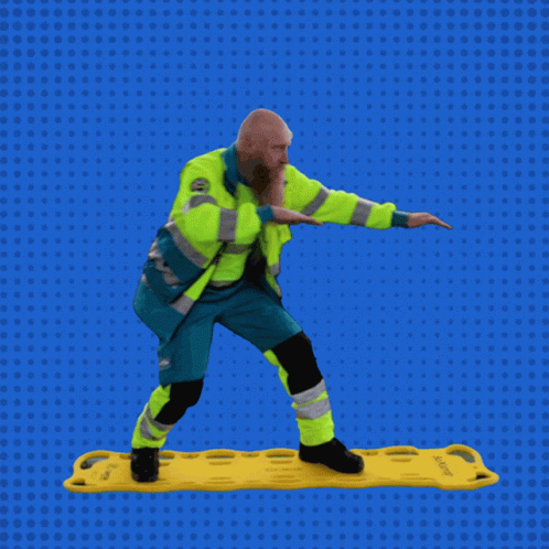 A funny paramedic in uniform playfully 'surfing' on a yellow medical stretcher, celebrating Dagvandebrandweer.