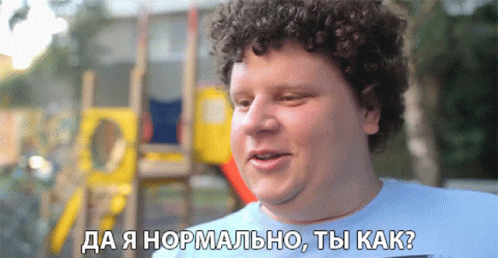Evgeniy Kulik, the Russian actor, smiles and speaks in front of a playground, with the caption 'I'M FINE, HOW ARE YOU?'