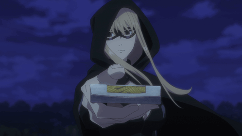 Daishikkaku Yumeko, a hooded figure, holds a glowing remote control, ready to activate something in the night.