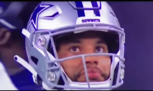 Dak Prescott, quarterback for the Dallas Cowboys, looks up intently while wearing his team helmet.