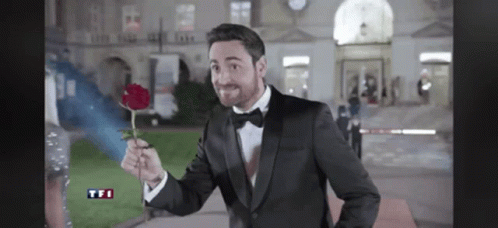 A man in a tuxedo holds a red rose, smiling, in a scene from Dals Danseaveccams, possibly featuring Combal.