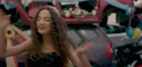 Maysa Daw dancing energetically to Emta Njawzak Yamma, surrounded by a unique, decorated backdrop.