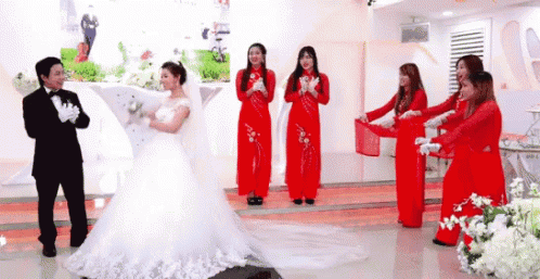 A bride throws her bouquet at a lively Vietnamese wedding, with bridesmaids eagerly and comically trying to catch it.