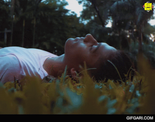 Dameer lying in the grass, looking up at the sky with wide eyes.
