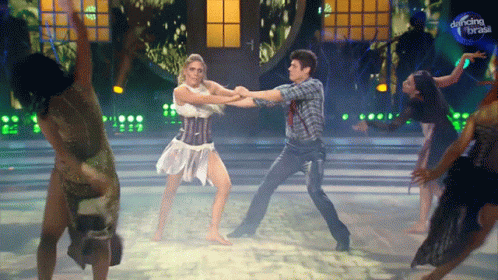 A dynamic couple performs an impressive ballroom dance on the stage of Dancing Brasil, showcasing their skills.