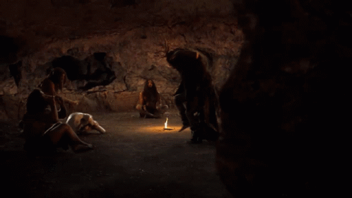 Primitive people gather in a dark cave for a ritualistic dance around a flickering light source.