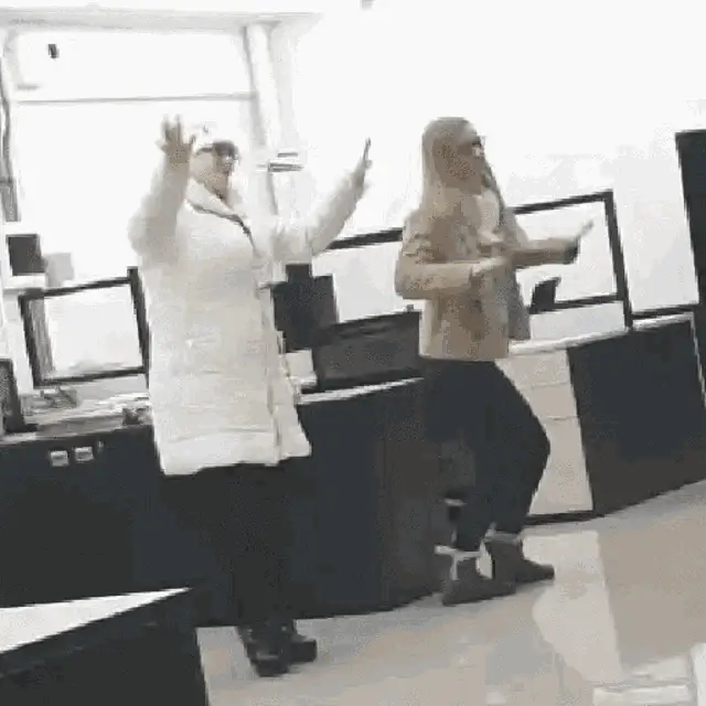 Woman screaming with arms raised at a lively party, in front of a sign that says ZGR, full of energy.