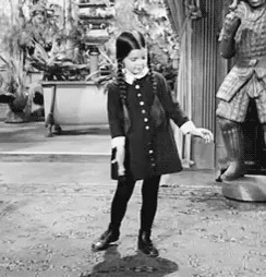 Wednesday Addams performs a carefree dance in a black dress, moving her arms and legs playfully in a garden setting.