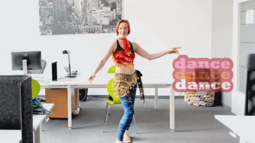 Julia Goessler performs an energetic belly dance in an office setting, wearing a vibrant, sequined costume.