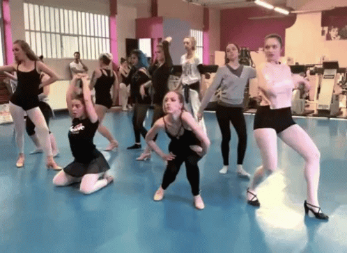 Group of girls performing a dance routine in a studio, showcasing various styles.
