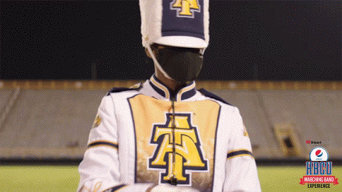 HBCU Marching Band member and masked drill team dancers perform energetic moves at BB&T Stadium.
