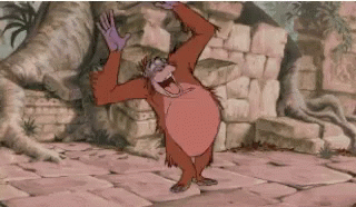 King Louie, the orangutan from The Jungle Book, performs a lively dance on a stone floor.