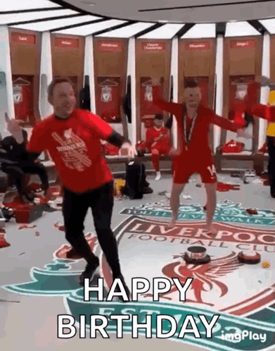 Pep Ljinders and Liverpool FC players celebrate with a dance party in the locker room, featuring a 'Happy Birthday' message.
