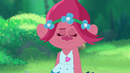 Poppy, the Trolls character, smiles with eyes closed, wearing a flower crown and blue dress.