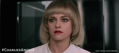 Kristen Stewart as Sabina in Charlie's Angels, performing a dance shimmy with a determined expression.