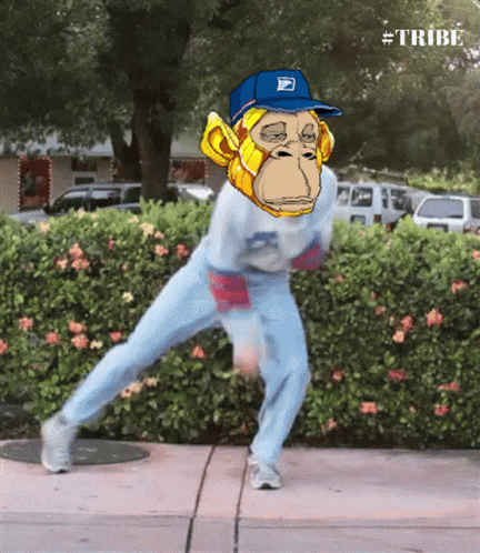 Bored Ape character with USPS hat dancing energetically in an outdoor setting.