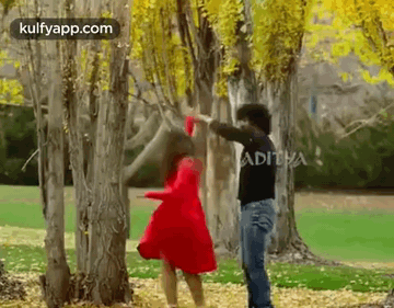 Nithya Shetty and Sudhakar Komakula dance joyfully in a park, surrounded by trees, with Nithya in a vibrant red dress.