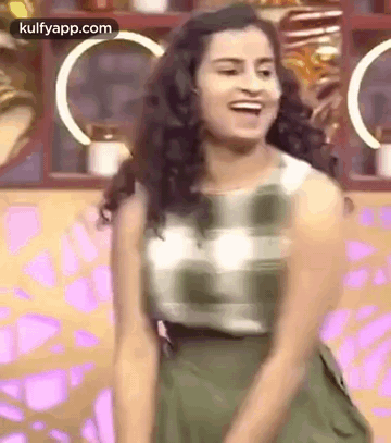 Shivangi dances energetically on a TV show set, laughing and enjoying the moment with lively expressions.