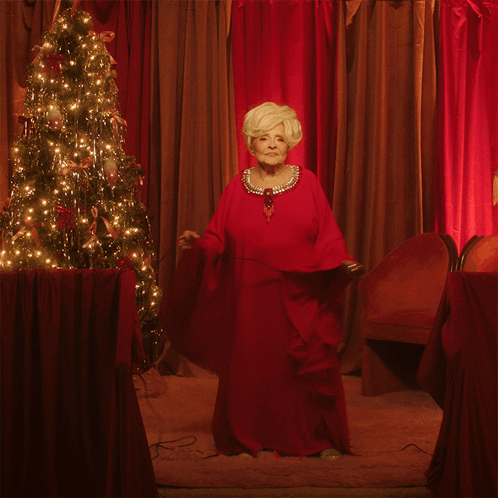 Brenda Lee dancing joyfully in a red dress in front of a festive Christmas tree at a holiday party.