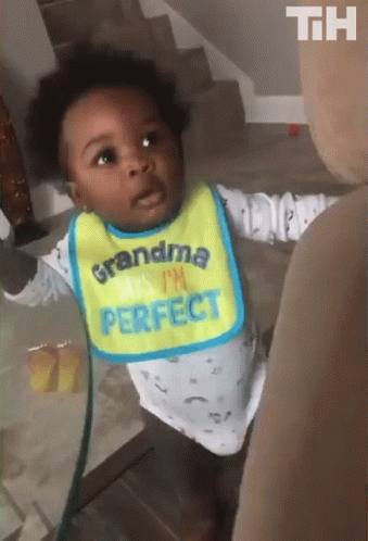 Adorable baby in a 'Grandma I'm Perfect' bib joyfully dances, waving hands in the air.