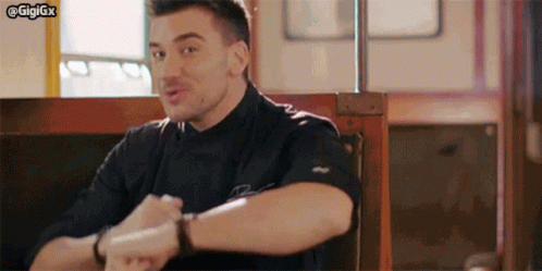 Damiano Carrara, known from Bake Off Italia, is seen dancing happily in a black shirt while sitting in a booth.