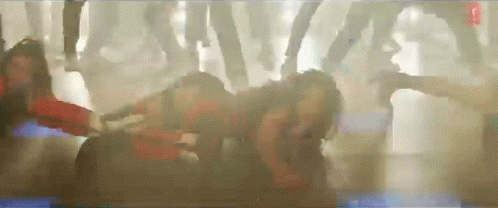 Nora Fatehi performing energetic dance moves on the floor in a dark room, surrounded by other dancers.