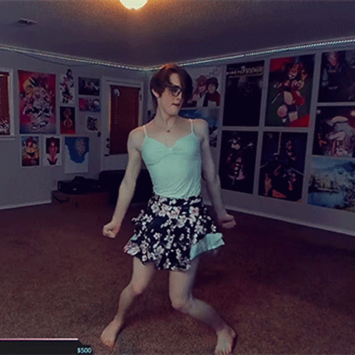 j4key performs energetic dance moves in a light blue top and floral skirt on a carpeted floor.