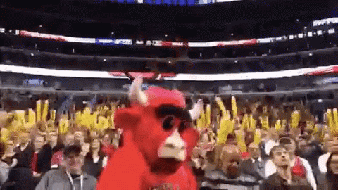 Benny The Bull, the Chicago Bulls mascot, energetically dances for the crowd at a basketball game.