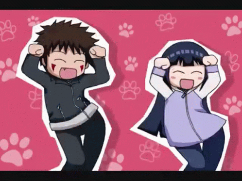 Naruto characters Hinata and Kiba perform the iconic Caramelldansen meme dance on a pink paw print background.