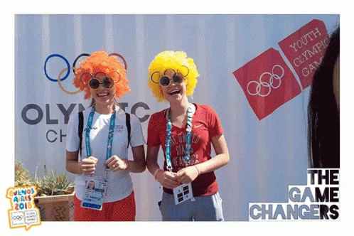 Two women in colorful wigs and sunglasses dancing happily at the Youth Olympic Games Buenos Aires 2018.