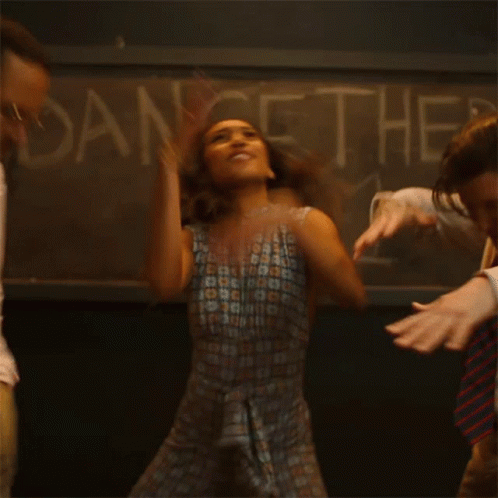 Sydney Park dances energetically in front of a chalkboard, vibing to the 'Not Giving You Up Song' by Big Time Rush.