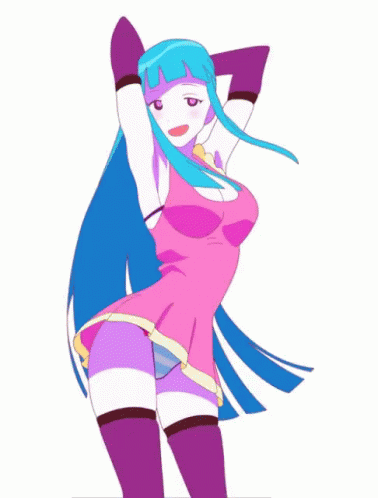 Animated girl with blue hair and a pink dress dancing in a vibrant anime style.
