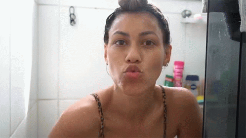Caroline Lima making a silly face and puckering her lips while in the shower, showing a playful moment.