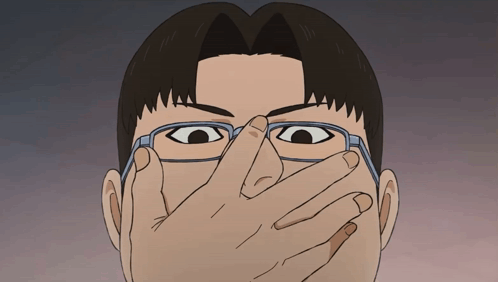 Kinta Sakata from Dandadan, wearing glasses and covering his mouth, showing a surprised expression.