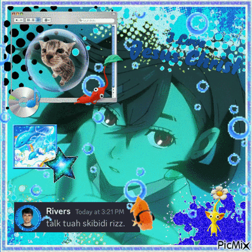 Momo Ayase from Dandadan featured in a vibrant picmix, with internet slang and a cat in a bubble.