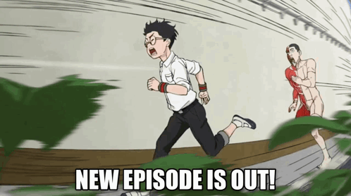 Okarun and Taro from Dandadan sprint intensely, announcing that a new episode of the anime is out!