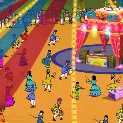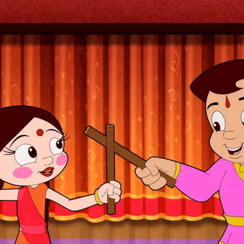 Chhota Bheem and friends celebrate Navratri with a vibrant Dandiya dance, playing traditional instruments.